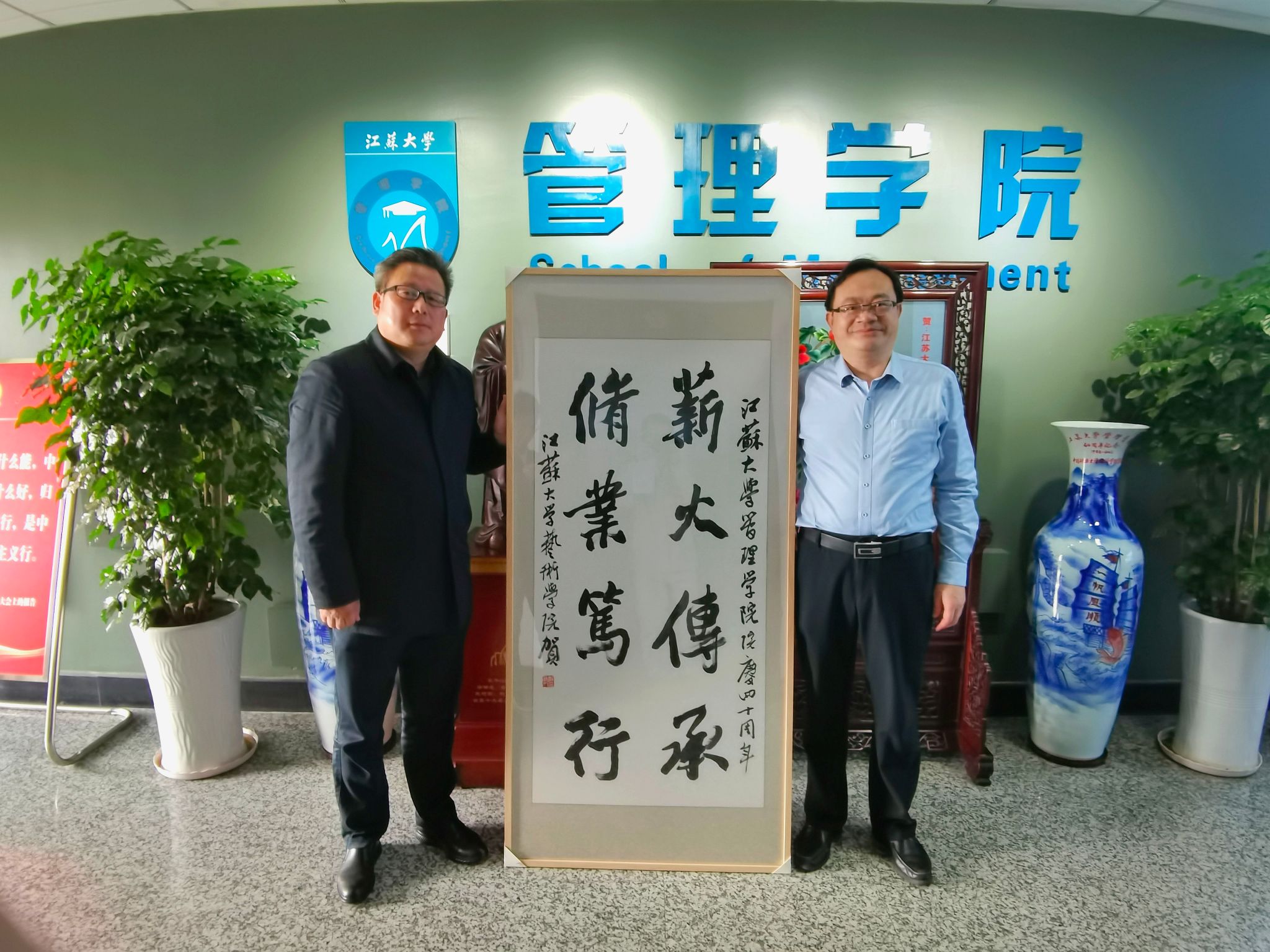闻我院办学40周年,日前,艺术学院党委书记朱立新代表学院向我院赠送《薪火传承,修业笃行》书法作品一幅,作为艺术学院对我院办学40周年的庆祝和祝福。我院院长杜建国教授代表学院接受赠画,并向艺术学院全体师生和郑为人老师表达了管理师生的喜悦及感激之情。